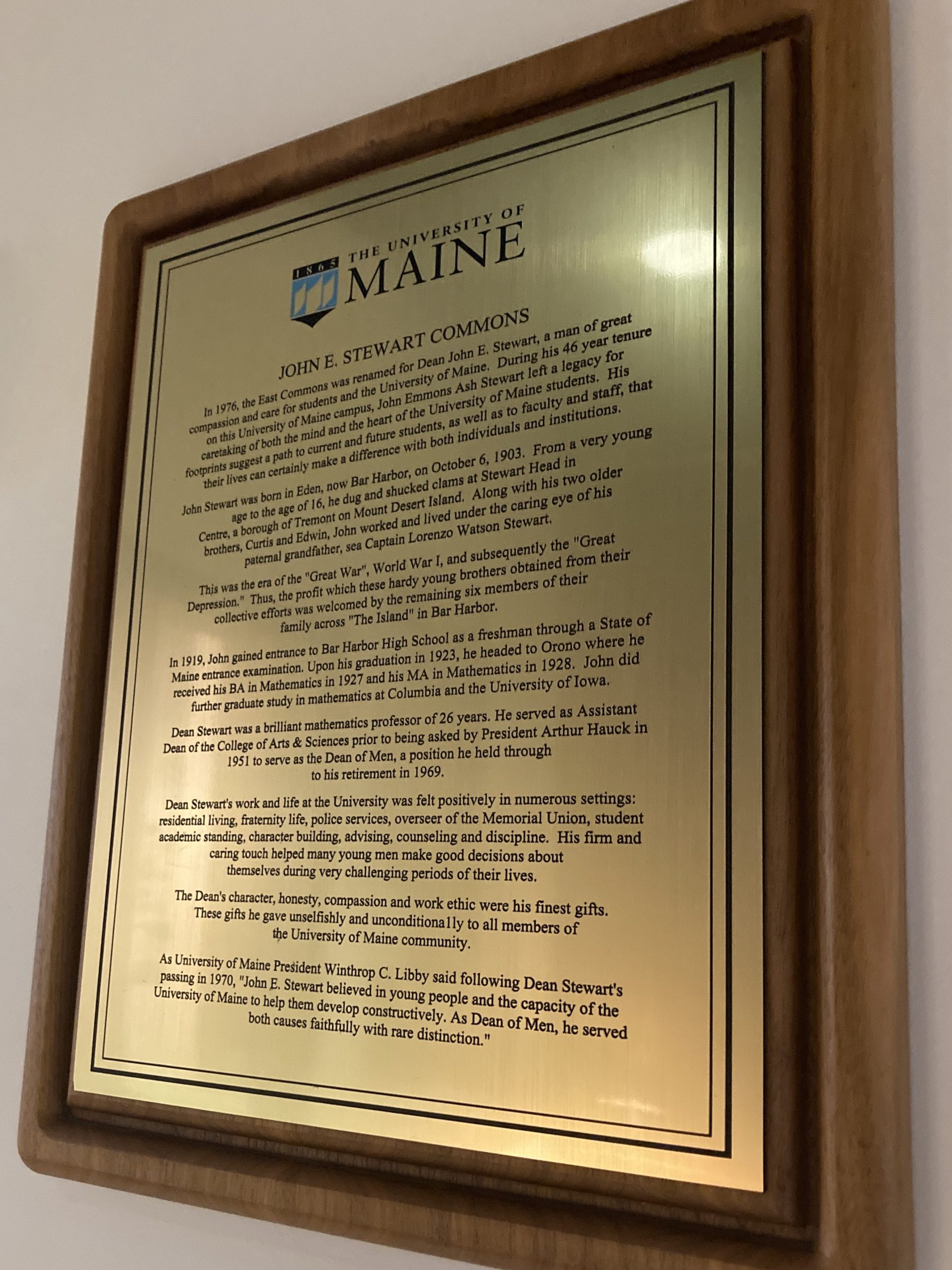 In 1976, the East Commons was renamed for Dean John E. Stewart, a man of great compassion and care for students and the University of Maine. During his 46 year tenure on this University of Maine Campus, John Emmons Ash Stewart left a legacy for caretaking of both the mind and the heart of the University of Maine students. His footprints suggest a path to current and future students, as well as to faculty and staff, that their lives can certainly make a difference with both individuals and institutions.